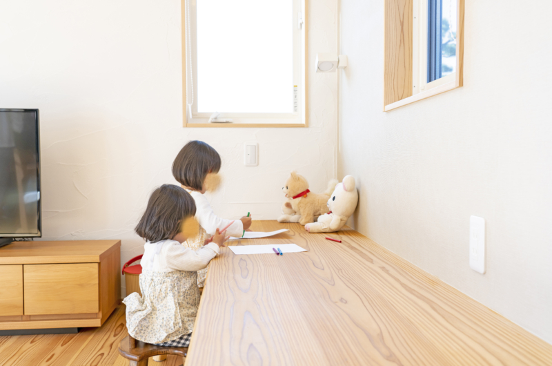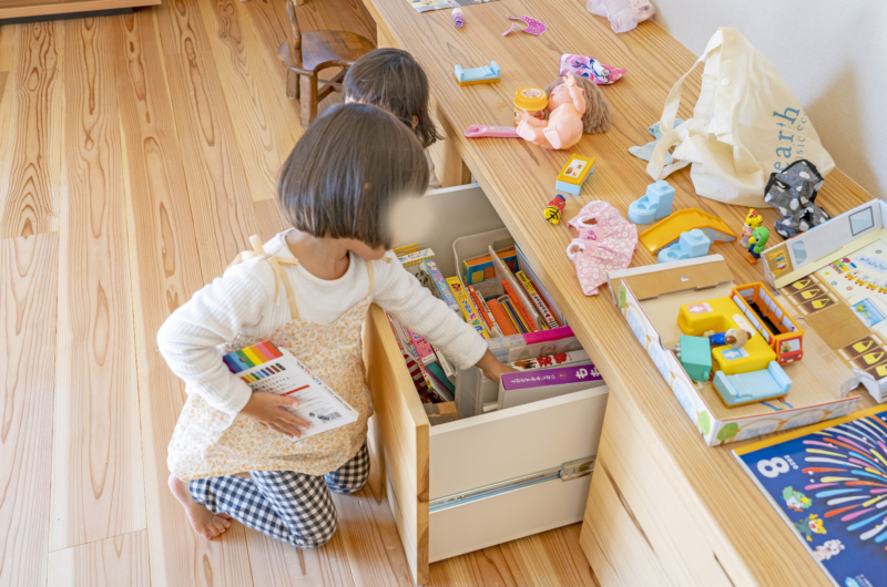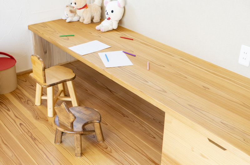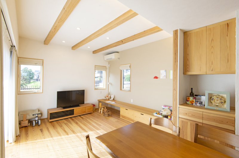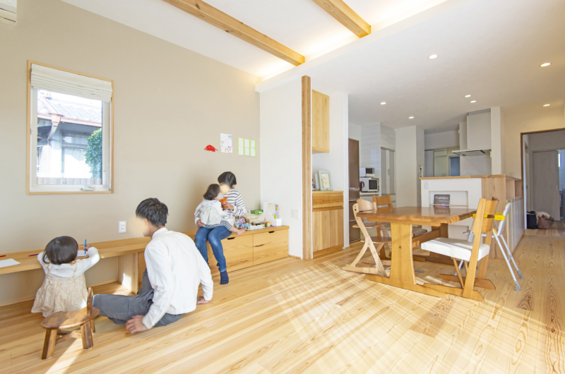 ベンチ・収納・子供用のテーブルにもなる備え付けの家具を設置。