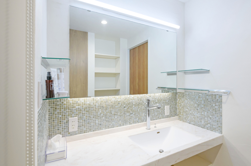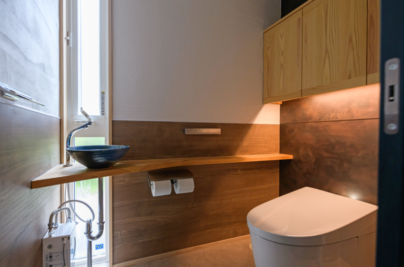 トイレの背面収納下に間接照明を取付、デザイン性の高い手洗い器を別に設置したことで、ホテルライクな雰囲気を演出。