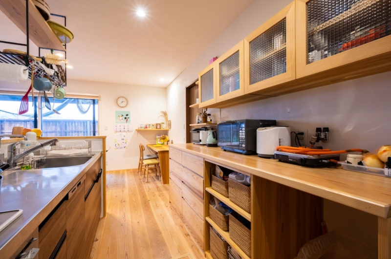 洗濯コーナーからファミリークローゼット・物干し場を一直線上に配置したり、キッチンを中心とした回遊動線、使いやすい収納を取り入れたりと家事のしやすさ動線に特に配慮された間取りもY様お気に入り。