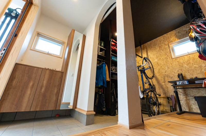 玄関から続く土間に収納されているのはご主人の趣味であるアウトドアグッズ。