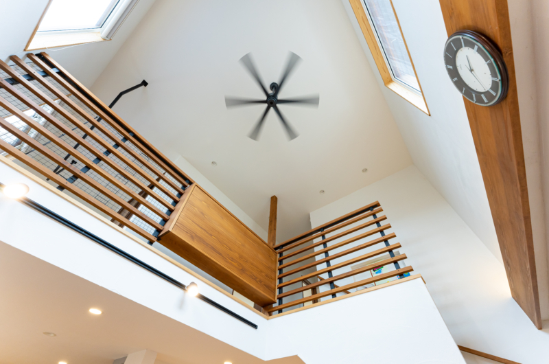 吹き抜け上の東側とリビング横の南がエアに配された大きな窓からは陽光が