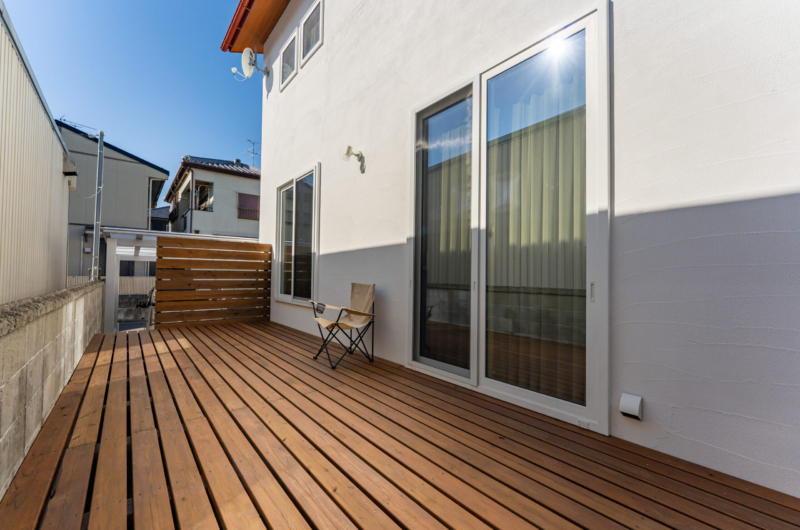 ウッドデッキやフェンスなどの外構部分には木材を採用し、