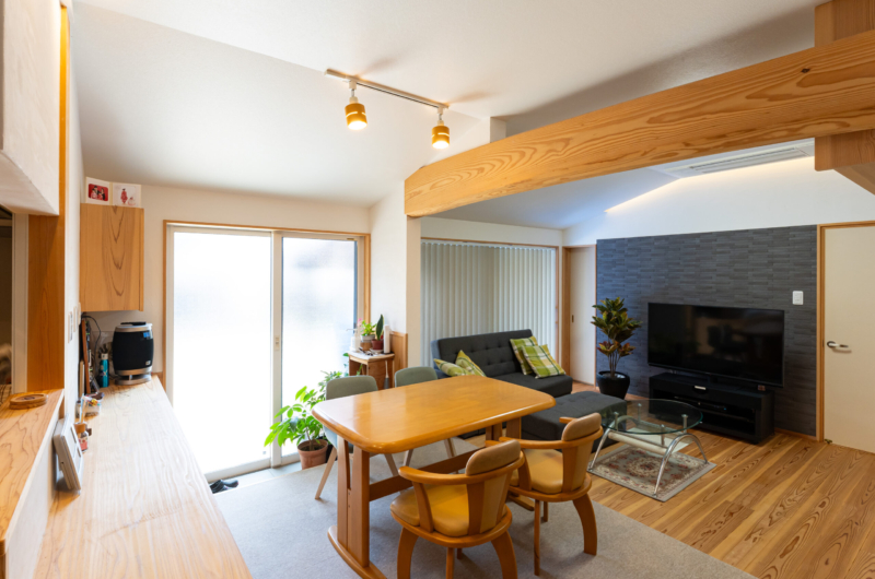 また、位置を変えてリビングとダイニングの間の見せ梁として使われています。