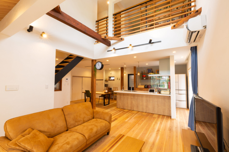 開放的な吹き抜けが広がり、無垢材のフローリングを貼ったリビング。