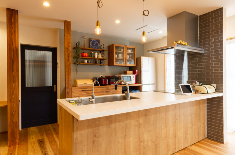W様邸では、動かせない柱に合わせてキッチンの収納棚や戸棚、スタディーコーナー等に造作家具を作りつけました。