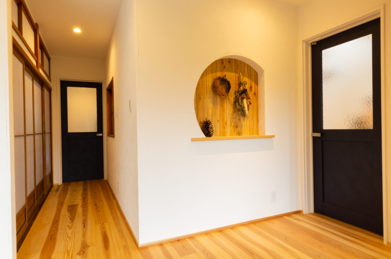 和風の外観からは想像もつかない、明るい玄関スペース。